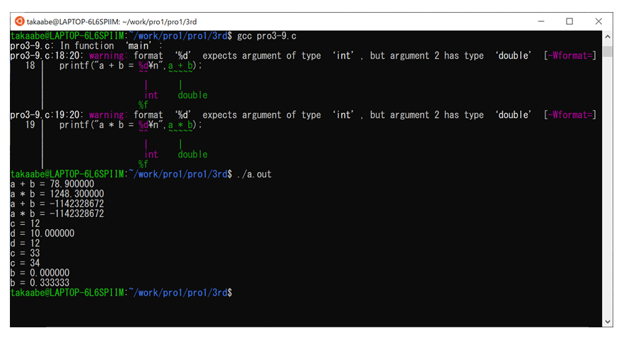 - A1:例題3-9の18,19行目は,あえてデータ型が異なる(間違っている)ときのprintf関数の動作をチェックするためのものです.