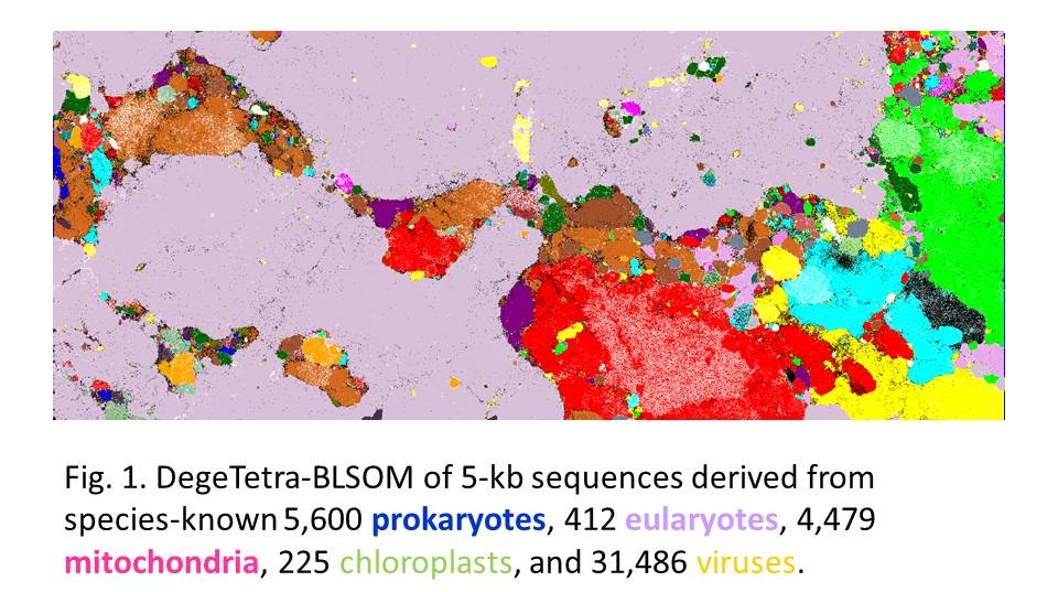 We found that BLSOM could classify genomic sequence fragments according to species without any information other than oligonucleotide frequencies in a wide range of genomes (Fig. 1). BLSOMs could recognize and visualize, in most sequence fragments, species-specific characteristics of oligonucleotide frequencies, permitting species-specific classification of sequences without any information regarding species. The BLSOM, which can systematically characterize species-specific genome signature of all prokaryotes and eukaryotes analyzable, proves a new powerful bioinformatics strategy to study biodiversity and molecular evolution.
