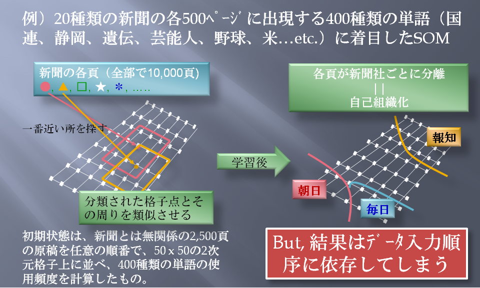 通常の演説原稿を例に取った場合では、どのような単語を選択するのかで、演説原稿別の分離(自己組織化)の程度が大きく左右されるはずである。我々の着目するゲノムの解析では、頻度を解析する連文字の長さを決めれば、例えば3連塩基を対象にした際には、64種類のトリヌクレオチドの全てを対象にするので、単語選択に関する曖昧さがない。初期状態に関しても、我々の主成分分析では、第1と第2主成分として定義するので、この点の曖昧さもない。SOMの学習では、どの順番で演説原稿のページの頻度データを計算機に与えるかでも、最終マップは変わるはずである。この種のデータの入力順への最終マップの依存性は、記憶の機構を解析する目的のSOMでは重要であるが、ゲノム解析ではむしろ障害になる。我々は一括学習型SOM(BL-SOM)を開発して、この問題も解決した。