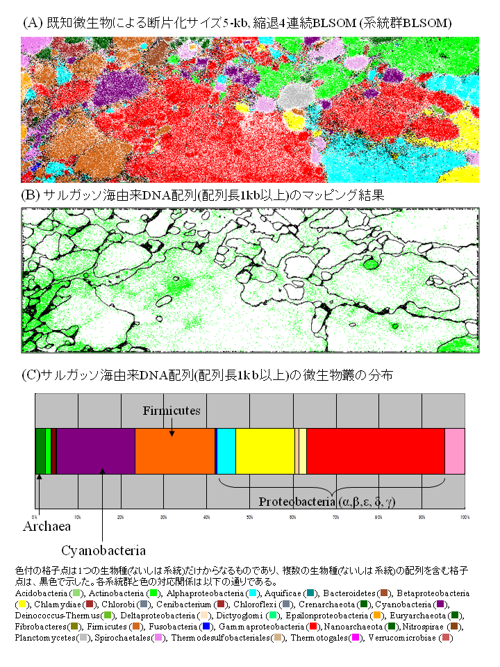 次に、原核生物の領域にマップされ配列類の原核生物内での系統を知る目的で、図2Aでは2,389種の既知の原核生物に由来する断片化サイズ5-kbの大量ゲノム断片配列を対象にした、縮退4連続塩基のBLSOMを作成しておいた(ここでは、原核生物の系統群BLSOMと呼ぶ)。この系統群BLSOM作成に使用した生物種が既知の2,389種の原核生物について、それらの28の系統群への分離を調べると、85%レベルで各系統群を反映した領域に分離(自己組織化)していた(図2A)。100%の分離には至っていないが、その主な原因は異種ゲノム間での遺伝子類の水平伝播によると考えている。図1Bにおいて先に原核生物の領域にマップされていたサルガッソ海由来のメタゲノム配列(14万件)を、この原核生物の系統群BLSOMへマッピングしたところ、BLSOM上の広範囲領域に散在しており、広範な生物系統に由来することが明らかとなった (図2B)。興味深いことに、優先種や優先属を反映すると考えられる、高密度にメタゲノム配列がマップされた領域も見られている。総合すると、原核生物の系統群の推定については、サルガッソ海由来の断片配列の約半数について、系統情報の付与が可能となった。このような手順で、着目環境に生息する微生物群集の生物系統の分布を知ることが可能となり、細菌叢の多様性を把握できる(図2C)。