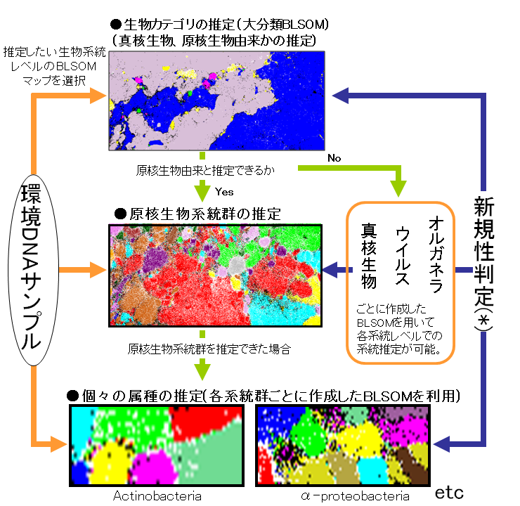 さらに解析を進めて、系統群別に既知の生物種の配列で予め作成しておいたBLSOM上へマッピングを続けることで、属や種レベルでの詳細な系統推定が可能となっている(8。このように真核生物・原核生物などの生物ドメイン、微生物の系統群、属種レベルと多段階的に生物系統を絞り込んでゆくことで、より詳細な系統推定が可能となる。さらには、得られた環境由来断片配列の新規性についても、多様な生物系統のレベルで把握可能であり、新規性の高い配列の効率的な検出が行える。BLSOMを用いた系統推定の解析の流れを図3にまとめた。