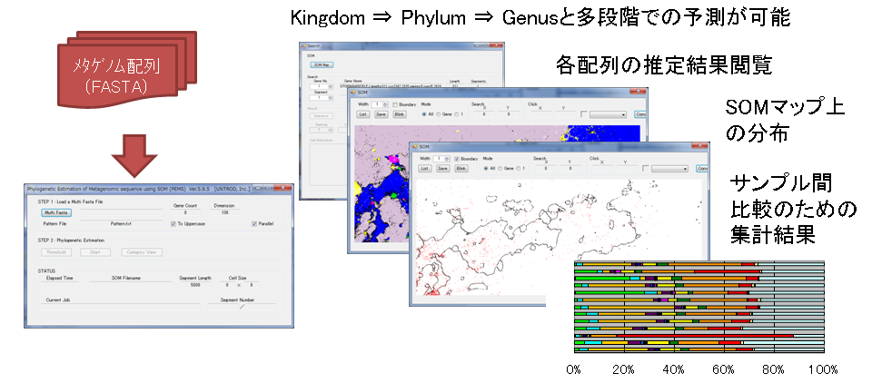 「BLSOMを用いたメタゲノム配列に対する生物系統推定解析」をワークフロー化した解析ソフトウェアPEMSを公開しました。ソフトウェアは、マルチFASTA形式の塩基配列ファイルを入力するだけで、300塩基以上の配列データに対し、3段階(Kingdom->Phylum->Genus)での絞り込みによる生物系統推定を実施します(図4)。