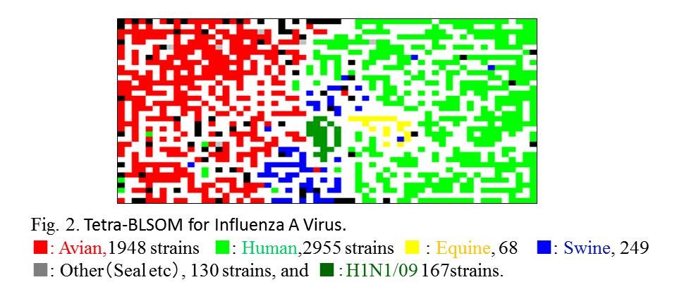 Influenza A viruses cause a significant threat to public health as highlighted by the recent introduction of the swine-derived H1N1 virus (pandemic H1N1/09) into human populations. By analyzing oligonucleotide and codon frequencies with BLSOM, we can analyze and compare all influenza A virus genome sequences registered in the public DNA Databanks on one plane. Separation according to host animal, subtype and epidemic year could be efficiently visualized (Fig. 2). Notably, H1N1/09 strains have oligonucleotide and codon compositions clearly distinct from those of seasonal human flu strains. This enabled us to make inferences about directional changes of H1N1/09 sequences in the near future and to list codons and oligonucleotides with the potentiality of reduction in H1N1/09 sequences. The strong visualization power of BLSOM also provides surveillance strategies for efficiently detecting potential precursors to pandemic viruses.