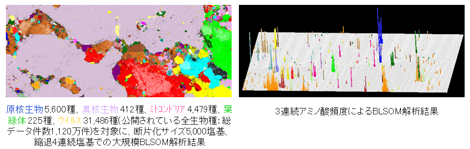我々は、人工知能を活用したゲノム情報解析手法の開発とその応用を行っています。例えば、ゲノムビッグデータから有用な知識を発見するために、全ゲノム情報をある一枚の2次元平面図上に集約し、その全体像を容易に可視化できる機械学習手法(一括学習型自己組織化マップ、BLSOM)を開発し、生物系統ごとにグループ分け可能なことを示しました(下図)。これはATGCの文字の連なりに微生物からヒトまでの全ての生物系統ごとに固有な特徴が存在していることを示しています。この解析は、通常の計算機では途方もない計算時間が必要なため、スーパーコンピュータによる大規模並列計算(地球シミュレータ, 国立遺伝学研究所スパコン)を行って、初めて得ることができました。